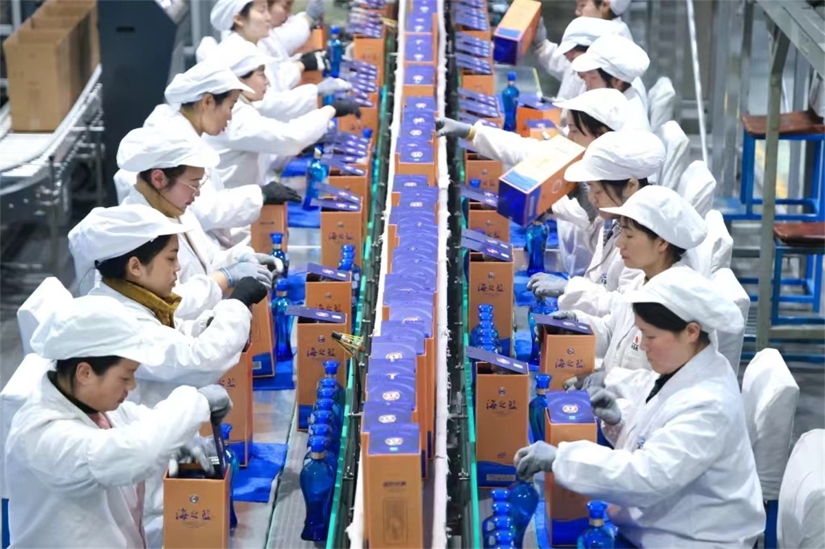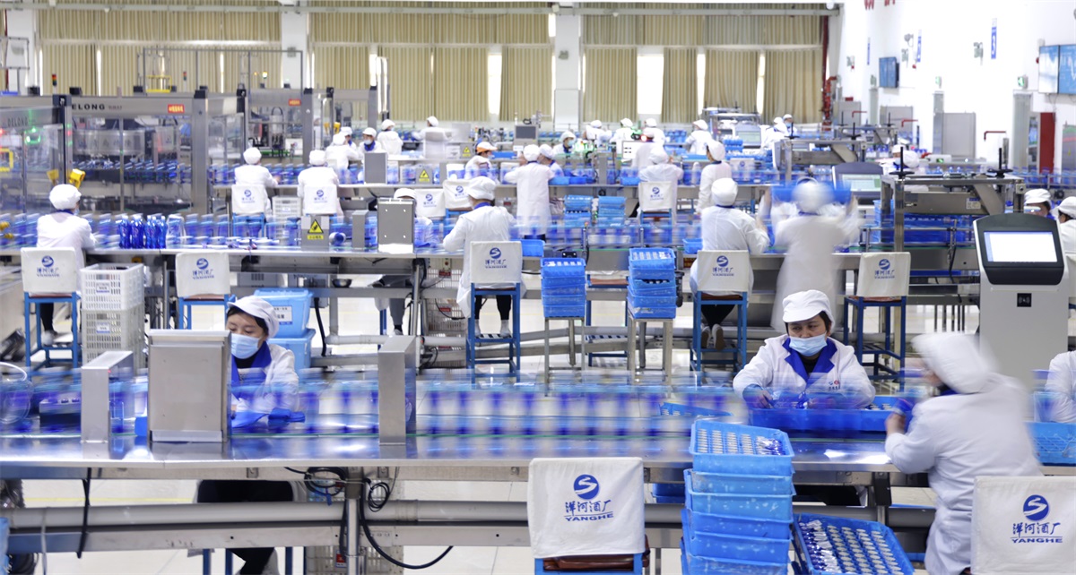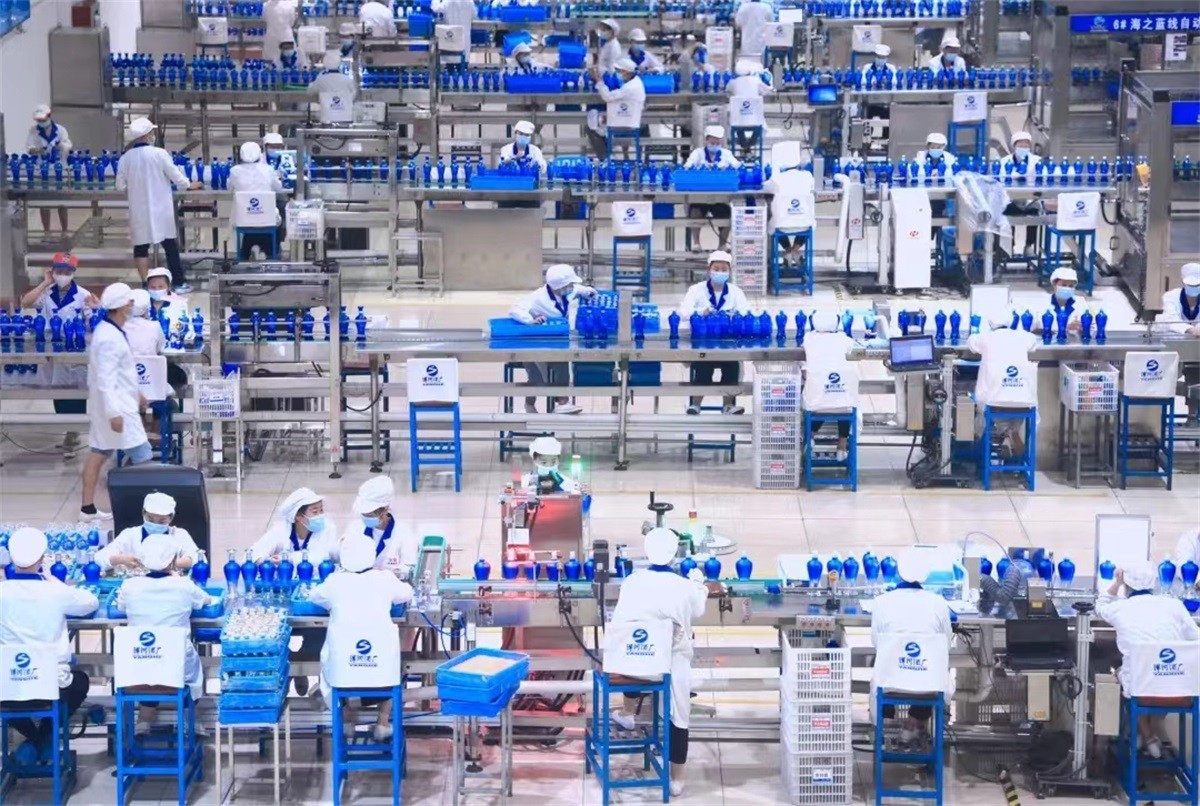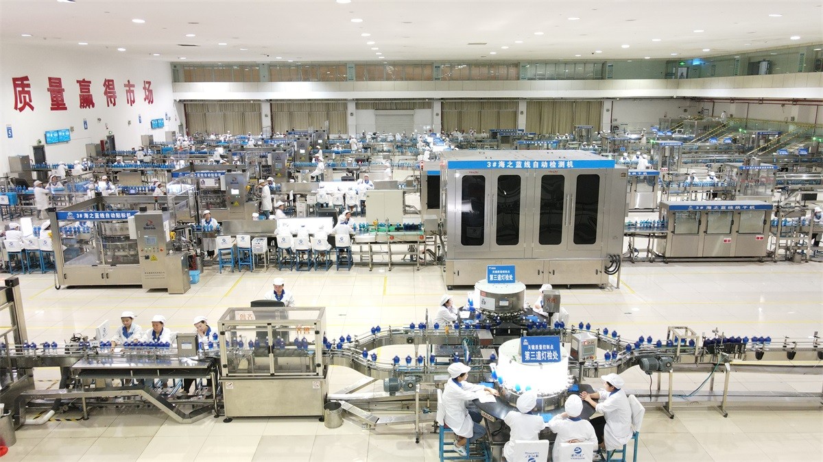 公司一号包装车间主要生产的是“蓝色经典系列产品”,车间分为洗瓶区、灌装区、装箱区、码垛区四大功能区,内置八条流水线,每条流水线每小时的产能不低于6000瓶。