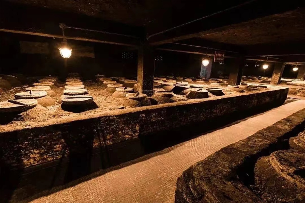 地下酒窖内共有陶坛3800余只,储酒陶坛坛龄在百年以上,被誉为“中国白酒的地下宫殿”。储存的原酒在独特的培土窖藏环境中,历经岁月沉淀,酒体自然老熟,成为滴滴珍贵的稀世陈酿,被称为“液体黄金”。