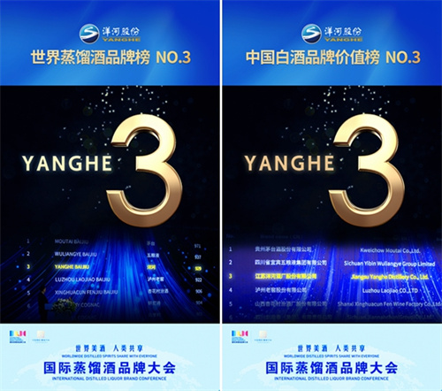 10月25日,“世界美酒·人类共享”国际蒸馏酒品牌大会在四川泸州举办,国际蒸馏酒知名品牌云集一堂。会上,《世界蒸馏酒品牌榜》和《中国白酒品牌价值榜》两项权威榜单发布,洋河凭借卓越的品质实力、品牌实力和国际影响力荣登世界蒸馏酒品牌榜第三名、中国白酒品牌价值榜第三名,品牌价值再攀世界新高度。