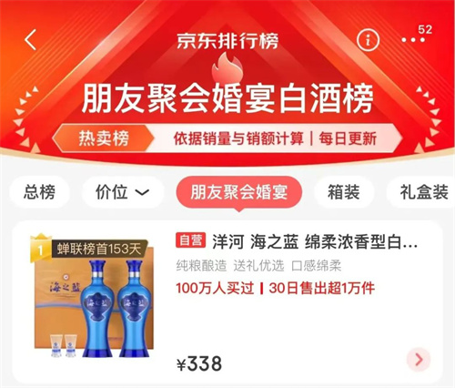 当前,海之蓝复购需求旺盛,已成为各零售网点的普遍现象。有消费者向记者表示:“海之蓝有情怀、有品牌、有品质,满足了人们对一瓶好酒的所有想象。”当下,海之蓝不仅在线下市场消费者购买势能强劲;在线上市场,海之蓝也赢得众多消费者的拥趸。在京东公布的“白酒金榜TOP20”中,海之蓝以综合分92.8分的人气,20万人的好评从超26亿件商品中脱颖而出荣登榜单。