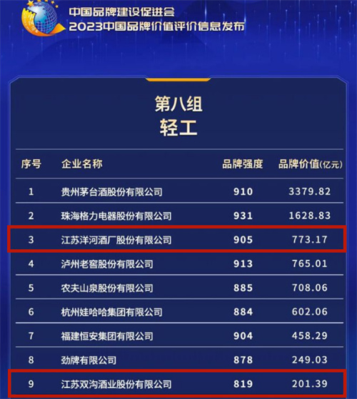 近日,由中国品牌建设促进会联合新华社、中国资产评估协会等单位主办的“2023中国品牌价值信息发布会暨中国品牌建设高峰论坛”在浙江德清盛大举行。洋河股份品牌价值再创新高,以773.17亿元品牌价值荣登轻工领域第三、白酒行业第二;同时,双沟酒业以201.39亿元品牌价值,名列轻工领域第九。